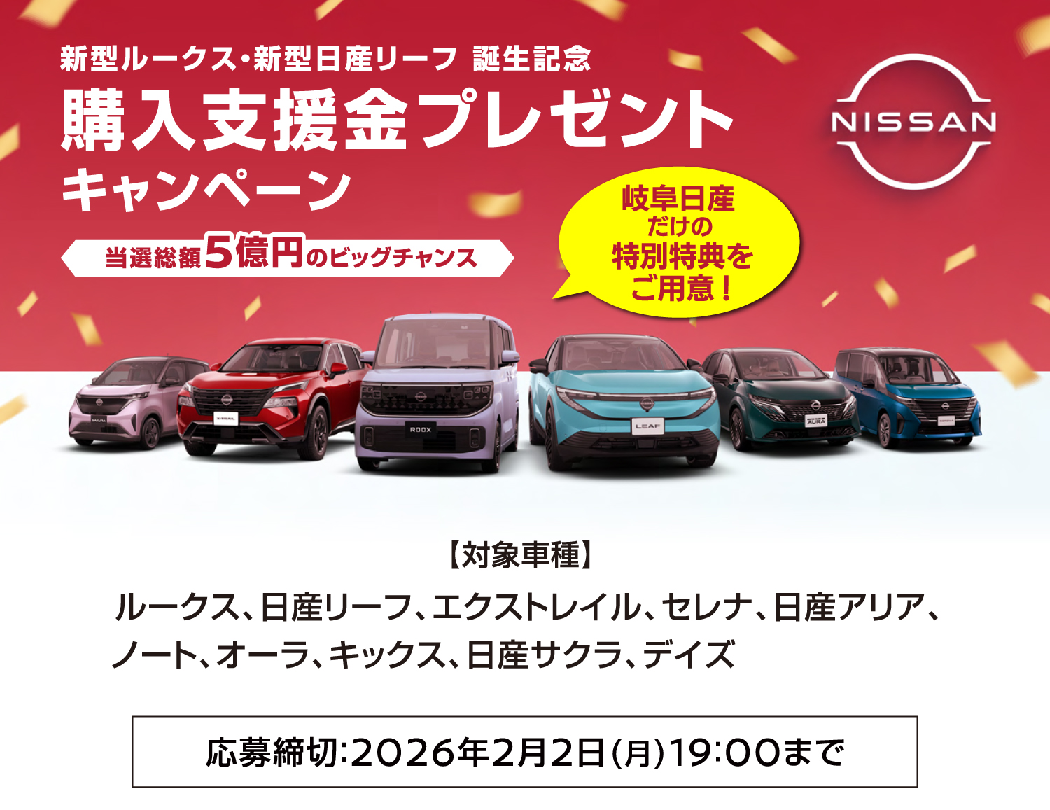 「新型ルークス・新型日産リーフ 誕生記念 購入支援金プレゼントキャンペーン」に応募後、抽選ナンバーを取得し、2026年2月2日(月)までに店舗で試乗された方