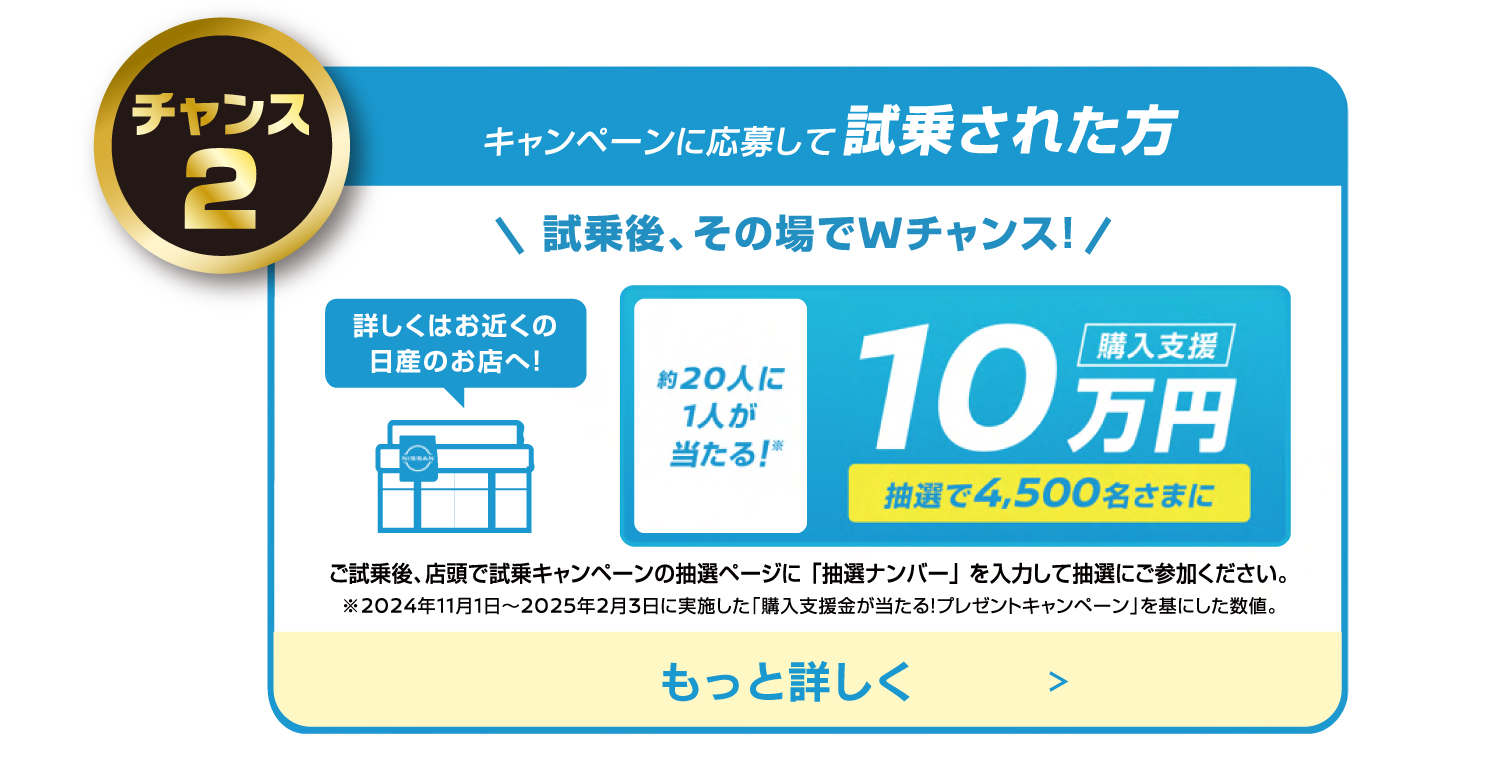 ●キャンペーン応募後に「W チャンス 試乗キャンペーン」にもご参加いただいた方の中から4,500名さまに10万円