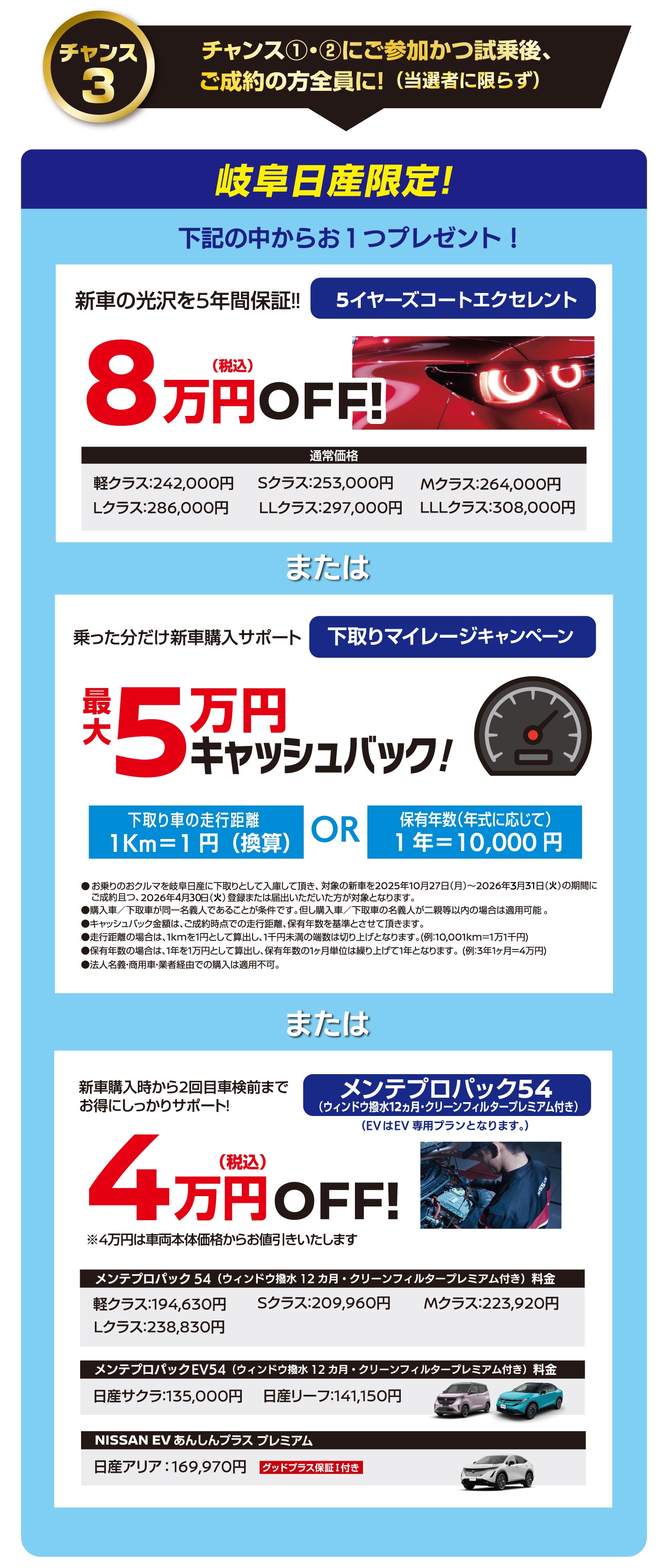 ●日産販売店以外の業販店等で日産自動車の新車購入をされる際は、本キャンペーンの商品適用外となります。
