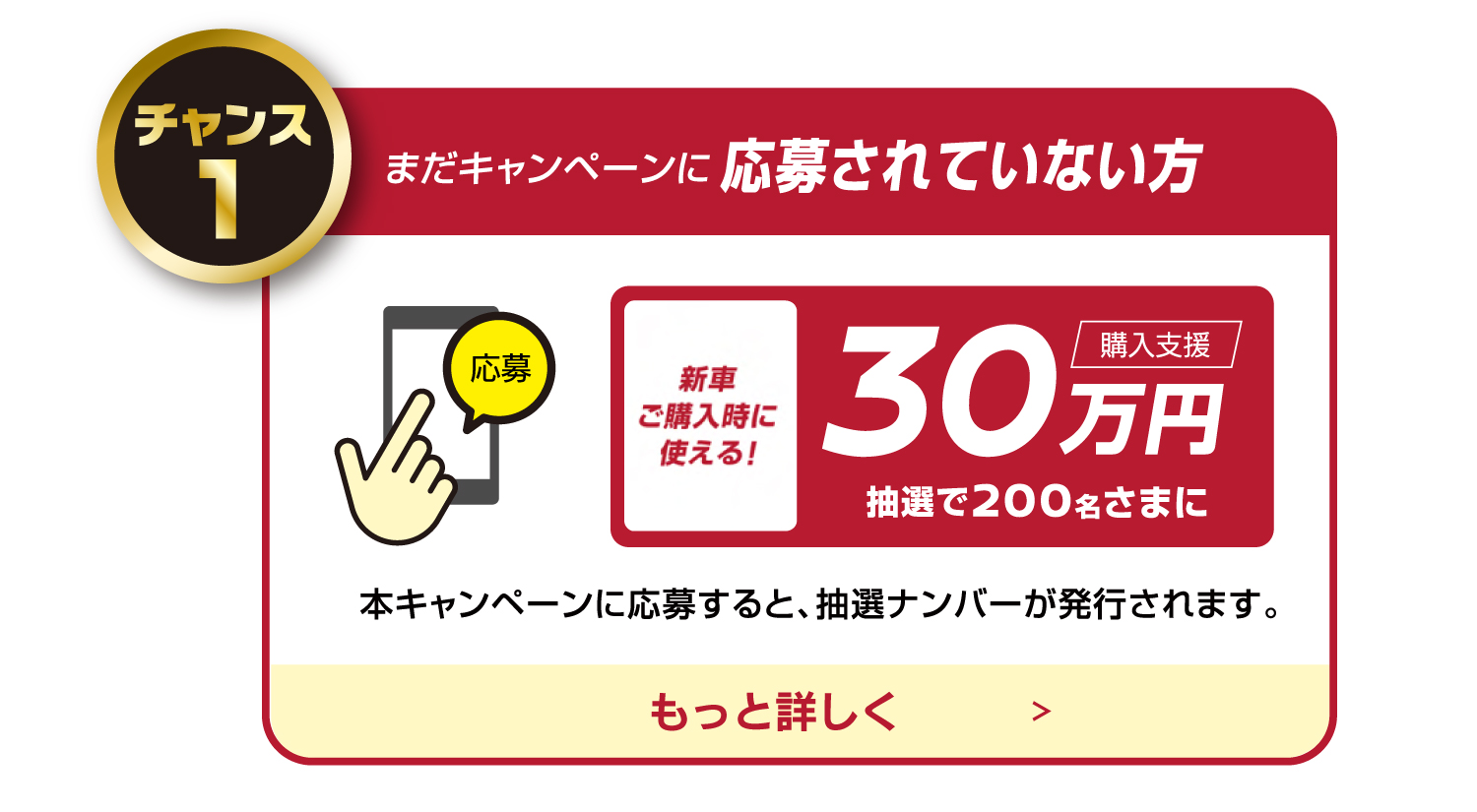 ※おクルマ1台のご購入につき、購入支援金プレゼントキャンペーンでの購入支援金30万円、試乗キャンペーンでの購入支援金10万円それぞれ1回ずつまでのご利用に限ります。