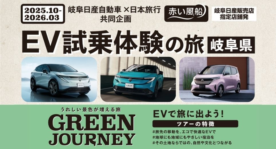 岐阜日産×日本旅行さま共同企画! 走行時のCO2排出ゼロのEVに乗って、その土地ならではの食や文化を楽しみながら地球にやさしいホテルへの宿泊を楽しんでみませんか? 『日産アリア、日産リーフ、日産サクラ』の試乗車の中からお選びいただけます。