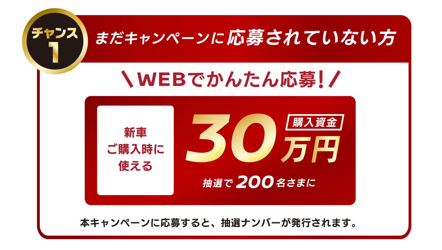 (1)「話題の新型車も対象に! 購入資金プレゼントキャンペーン」応募後に応募完了ページ・応募完了メール・キャンペーンの抽選結果メールにて、抽選ナンバーが発行されますので、ご確認ください。