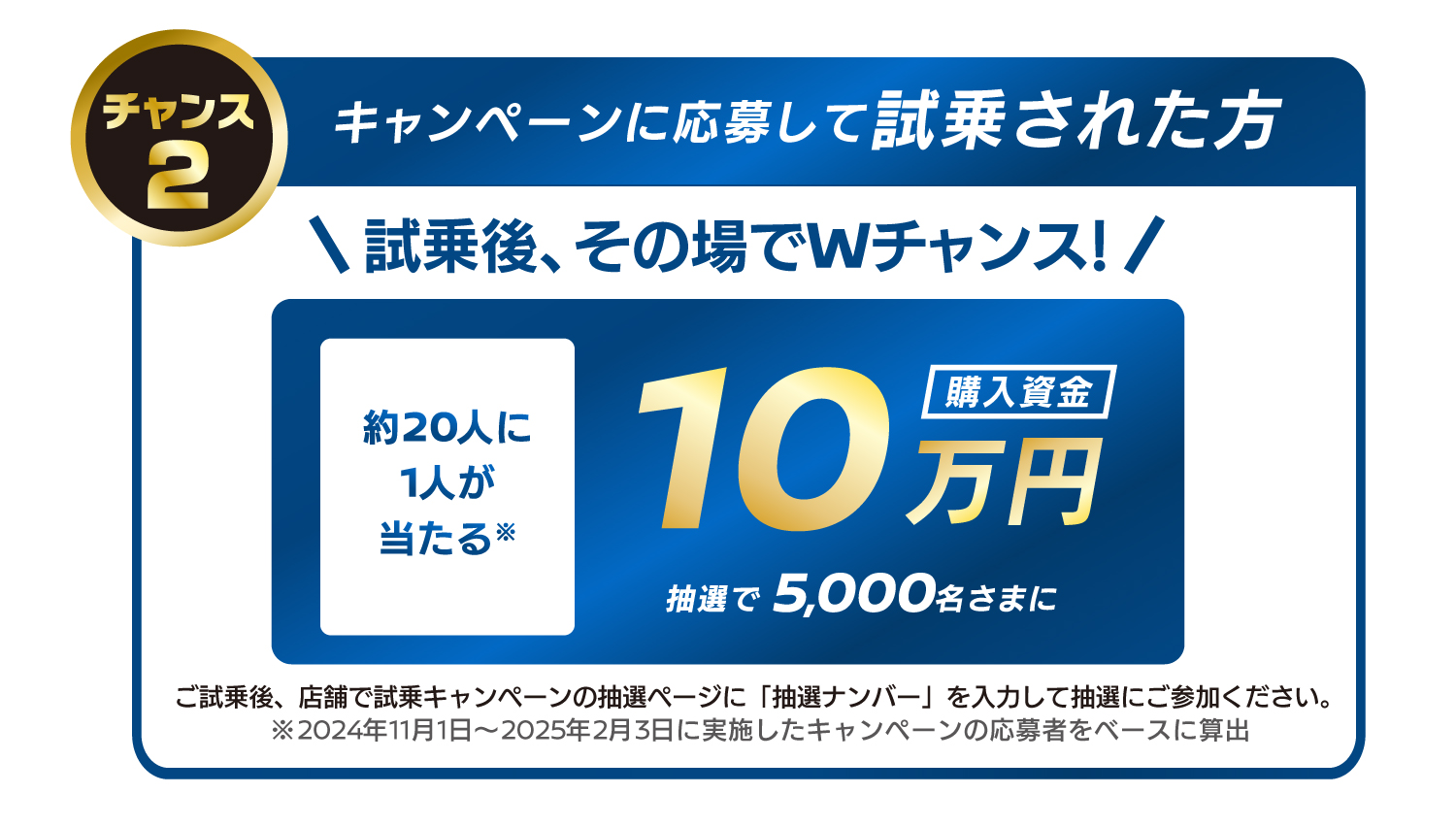 ●キャンペーン応募後に「W チャンス 試乗キャンペーン」にもご参加いただいた方の中から5,000名さまに10万円