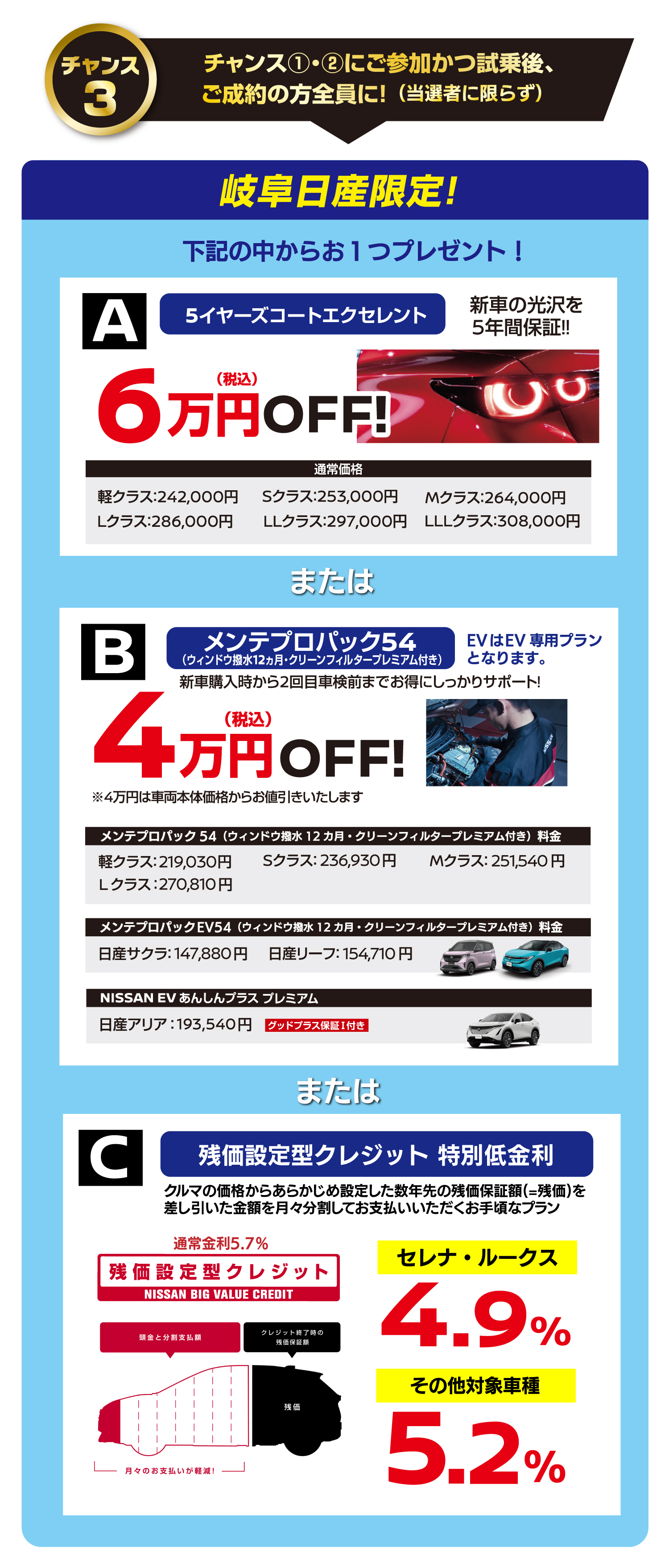 ●日産販売店以外の業販店等で日産自動車の新車購入をされる際は、本キャンペーンの商品適用外となります。